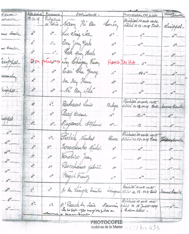 Dans ce document est mentionné l’arrivée d’une trentaine de coréens, parmi eux In Chyion Fuan l’alias utilisé par Hong Jae-Ha. Malgré l’utilisation d’un alias, on note qu’il est enregistré comme Coréen (le “d” signifiant Idem). Il faut savoir qu’à une époque où la nationalité coréenne n’existait pas, se revendiquer en tant que tel était déjà un acte de résistance qui pouvait le mettre en péril (expulsion, contrôle par les autorités françaises et japonaises).