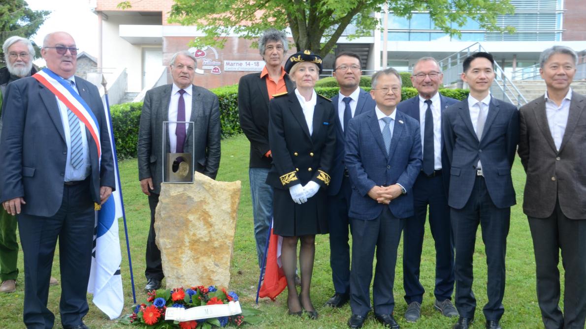 Traduction du texte de la stèle en bronze : “A la mémoire des premiers coréens arrivés en France il y a 100 ans et en signe de l’amitié franco-coréenne. Le 19 novembre 1919 sont arrivés de Mourmansk en Russie à Suippes, Châlons-sur-Marne, France, trente-cinq jeunes ouvriers coréens, à la fin de la Première Guerre Mondiale. Ils ont activement participé à la reconstruction de la France tout en soutenant le mouvement d’indépendance coréen.