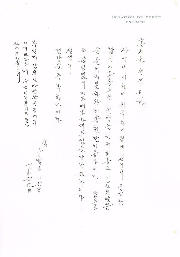 Voici un exemple de lettre échangée entre des hommes politiques coréens et Hong Jae-Ha que nous a fait parvenir son fils, Jean-Jacques Hong Fuan. Les lettres qu’il a gardé sont parfois postérieures au départ de Hong Jae-Ha pour Paris. Certaines de ces lettres ont été perdues ou ont été confiées au National Institut of Korean History (NIKH).