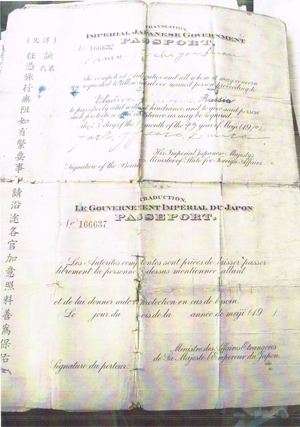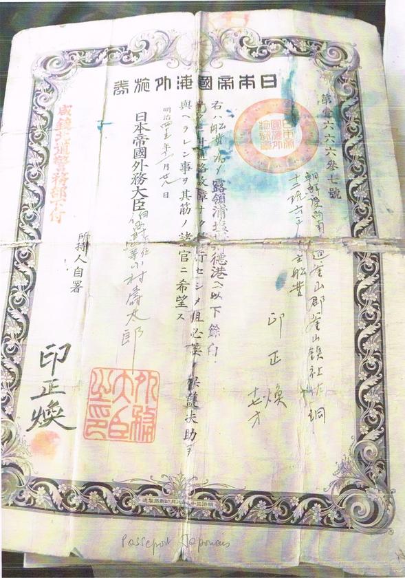 Passeports japonais de Hong Jae-Ha, délivré le 28 Janvier (?) 1910 (en 43 de l’ère Meiji) Documents fournis par Jean-Jacques Hong Fuan